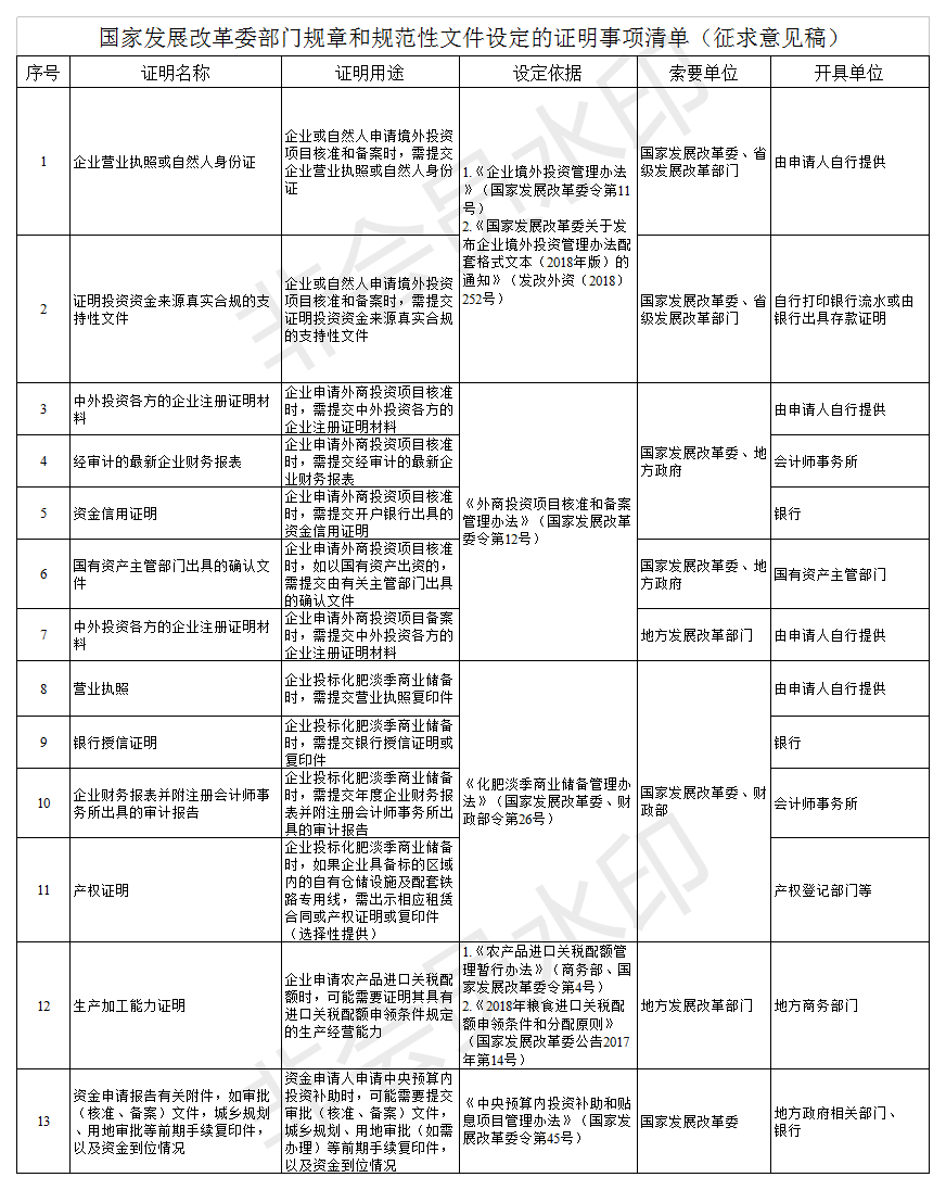 按照國務院辦公廳《關于做好證明事項清理工作的通知》(國辦發〔2018〕47號)要求,國家發展改革委對證明事項進行了全面清理,形成了《國家發展改革委部門規章和規范性文件設定的證明事項清單(征求意見稿)》,現向社會公開征求意見。