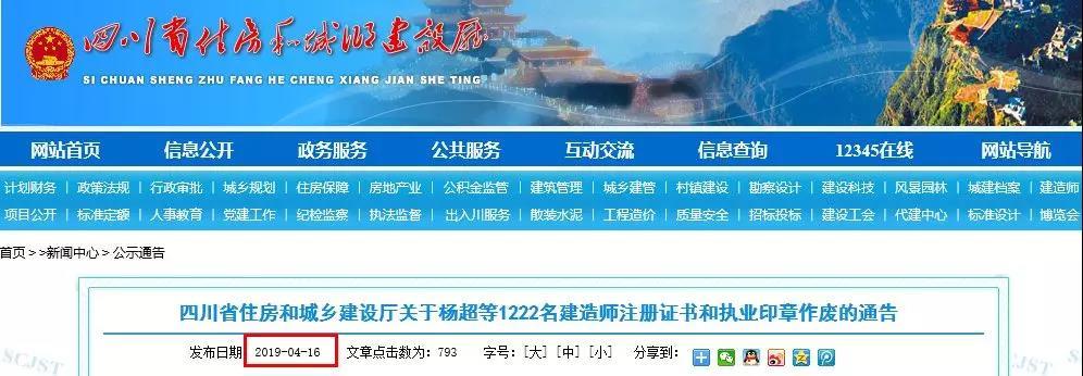 緊接著 ,今天(4月16日)上午,住建廳官網(wǎng)發(fā)布通告:楊超等1222名建造師 注冊證書和執(zhí)業(yè)印章作廢 。(在此之前,四川省住建廳已公布了胡冬梅等101人建造師注冊證書注銷名單。)