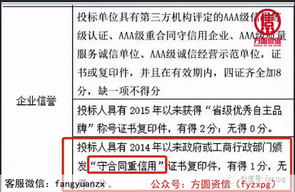 很多企業在投標的時候,都會面臨著競爭對手太多的困擾!投標企業一路披荊斬棘,哪怕一分之差都可能落選,一旦輸了之前所有的努力都是白費。若因為錯失了這些加分項而落選,豈不可惜?白送的分不要白不要,下面來看看招投標中常見的加分項有哪些? 一、政府行政機關項目顧問系列 競標強力加分高權威資質 1、招投標AAA級信用企業 2、AAA級信用企業 3、守合同重信用企業 4、省級著名商標/省級名牌產品認定 5、國家高新技術企業 6、雙軟認定—軟件產品+軟件企業 02、企業基本榮譽項目 二、投標加分提高市場競爭力 1、AAA級誠信經營示范單位 2、AAA級重合同守信用企業 3、AAA級質量服務信譽企業 4、全國消費者放心滿意品牌 5、中國名優產品 6、中國著名品牌 7、中國自主創新品牌 三、ISO三大體系認證 投標強制性加分證書 1、ISO9001-質量管理體系加分證 2、ISO14001-環境管理體系認證 3、OHSMS18001-職業健康安全管理體系認證 04、ISO管理體系其他認證 投標強制性加分證書 1、ISO22000-食品安全管理體系認證 2、ISO27001-信息安全管理體系認證 3、ISO20000-信息安全技術服務管理體系 4、ISO50001-能源管理體系認證 5、GBT 31950-2015 企業誠信管理體系認證 6、GB/T 29490-知識產權貫標體系認證 7、GB/T 27922-商品售后服務評價體系認證 05 環保認證 政府釆購指定認證資質 1、十環標志 2、CCC認證 3、CQC認證 4、節能產品認證 5、低碳認證 6、有機產品認證 申辦這些投標加分資質,有助于企業贏得更多的市場機會。不過由于招標類型多種多樣,不同類型的招標項目,對于可以加分的資質會給出不同的要求,同一個證書可能在這個招標項目中可以加分,另外一個招標項目中卻不能加分,具體應參考招標文件中要求。